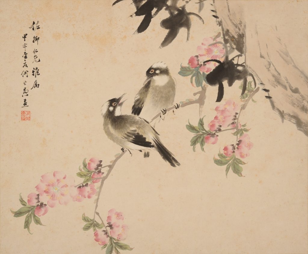 先日ご紹介した上巳の節句の錦絵に続き、今回は桃の花と戯れるかわいらしい花鳥図をご紹介します。
